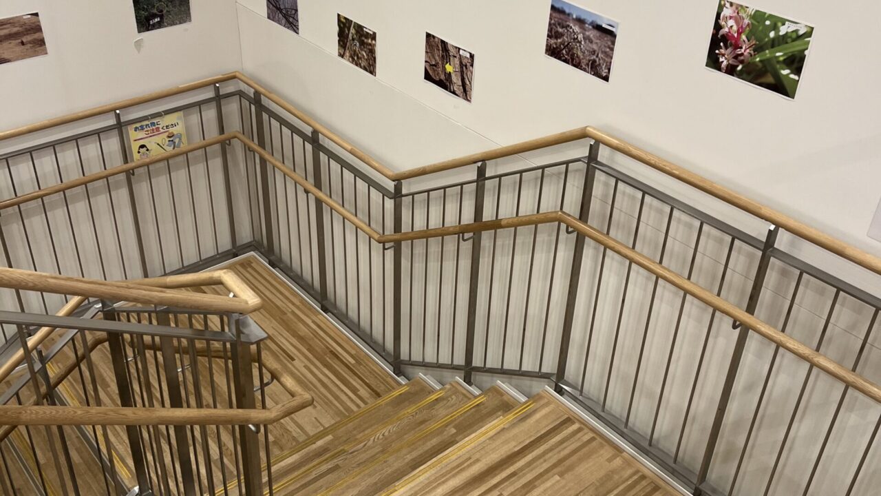 階段は左に折れる構造で、左右両方に手すりがあります。階段の途中には、壁に貼られた季節の写真がずらりと展示されてあります。