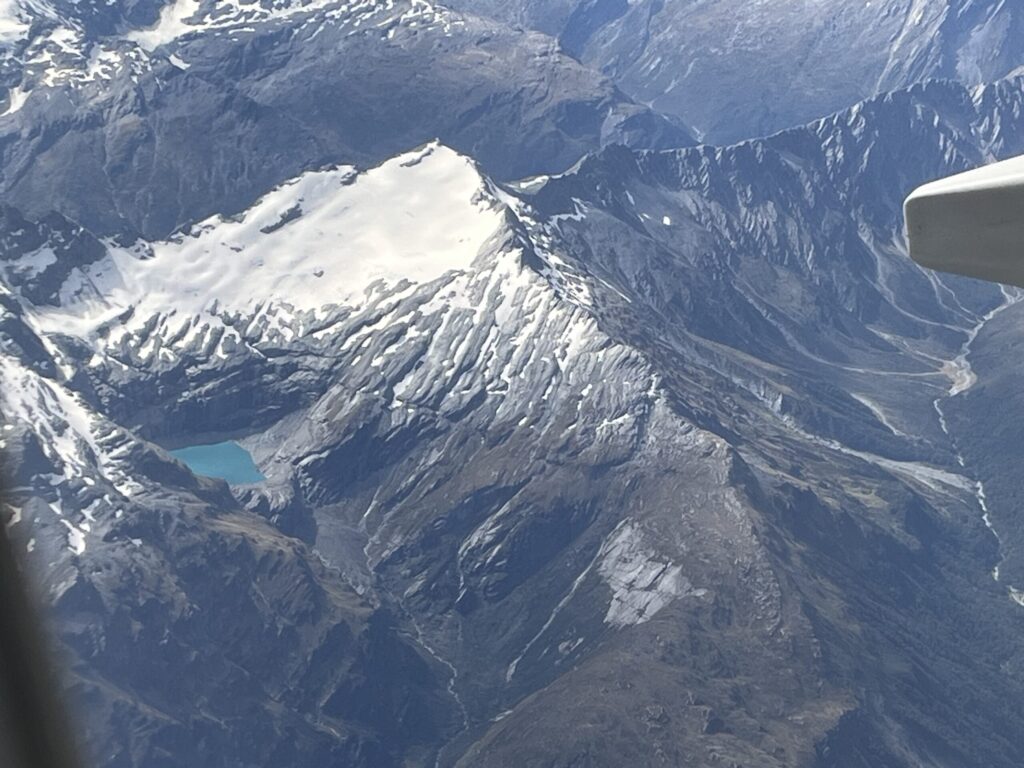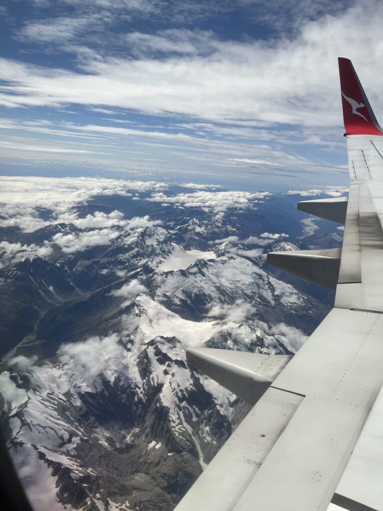 ニュージーランド上空に差し掛かって、雪山が見えてきました。この時点ですでにこの壮大な景色に奥様は感動していました。
