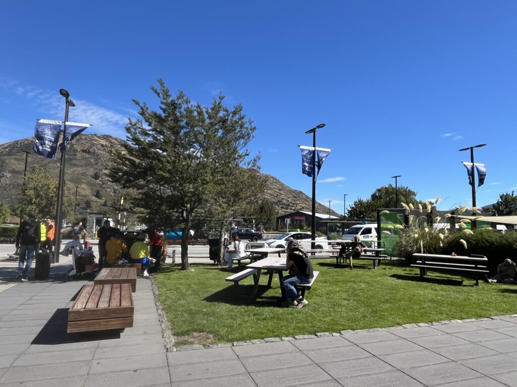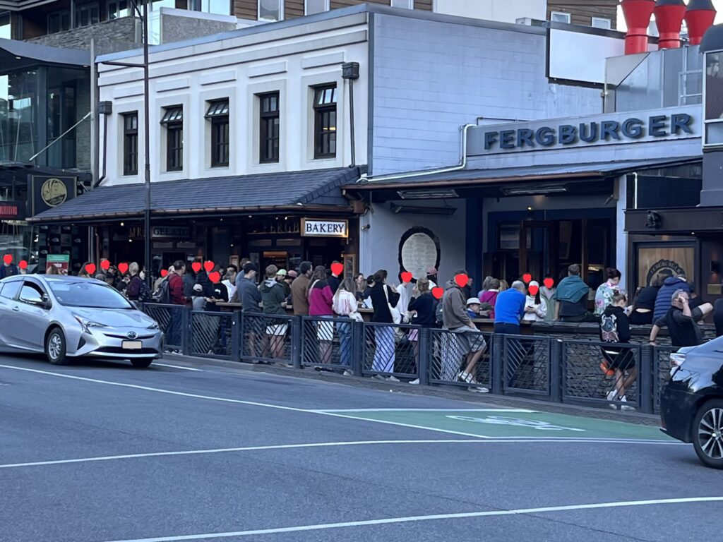 階段を降りて中心部の入り口に来ると、早速、名物ファーグバーガーの長蛇の列が見えてきました。クイーンズタウンに来たーと実感する瞬間です。