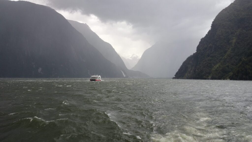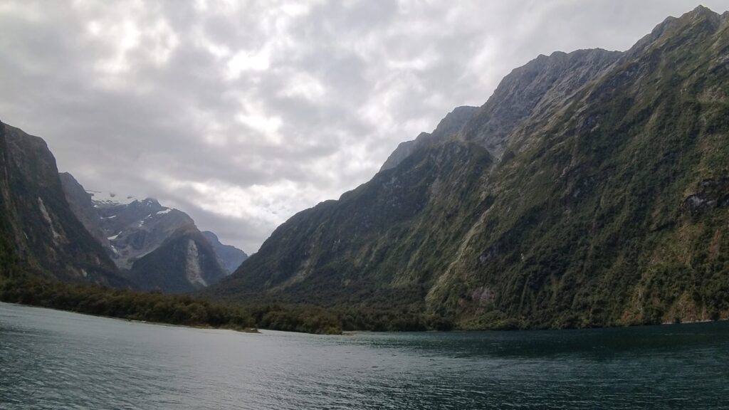 過去に出張でニュージーランドに来て、ミルフォードサウンドに初めて訪れた際は、こんなどんよりとした天候でした。