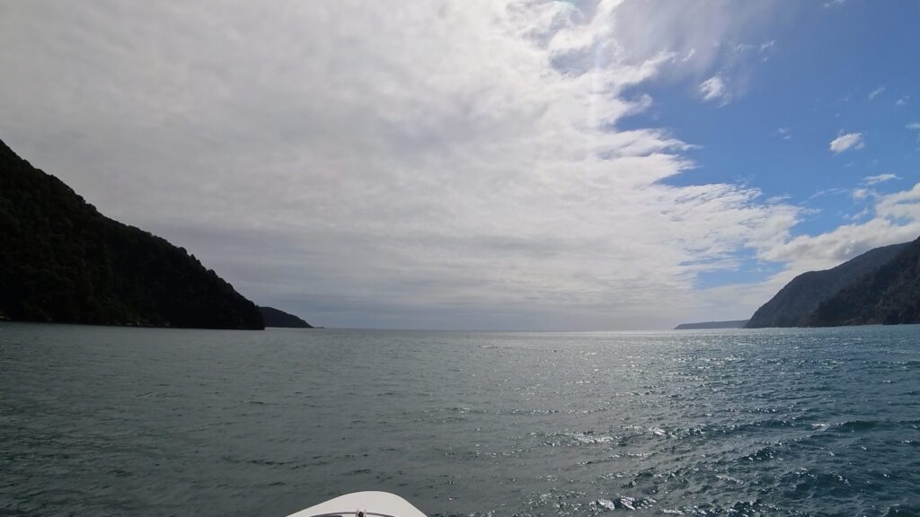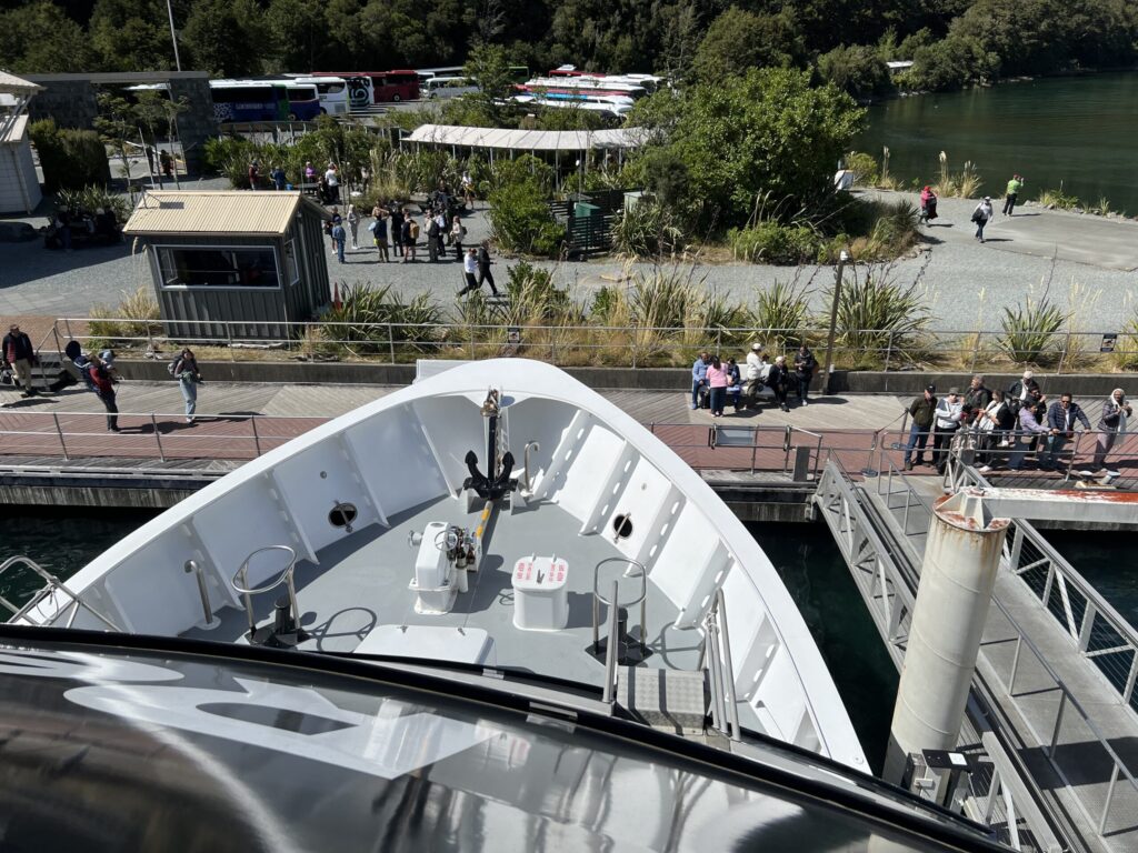 船が出発、Uターンして進んでいきました。船首のこのポジションがベストだとこの時確信しました。視界に邪魔が入らず、ミルフォードサウンドの景色を独り占めできるからでした。