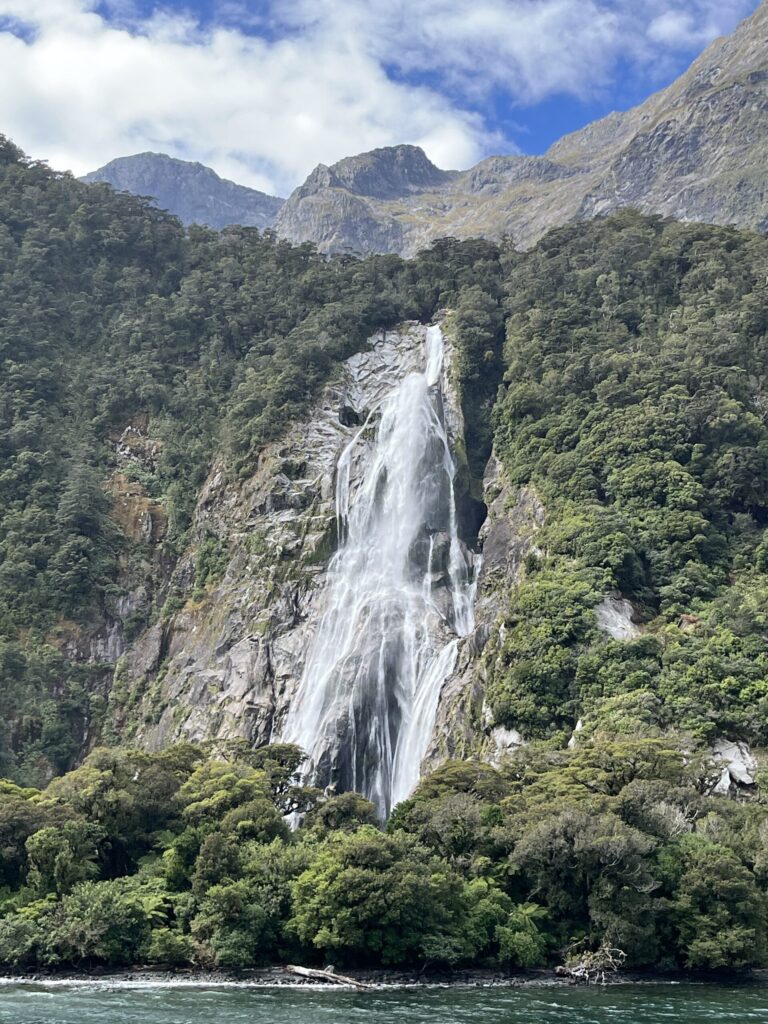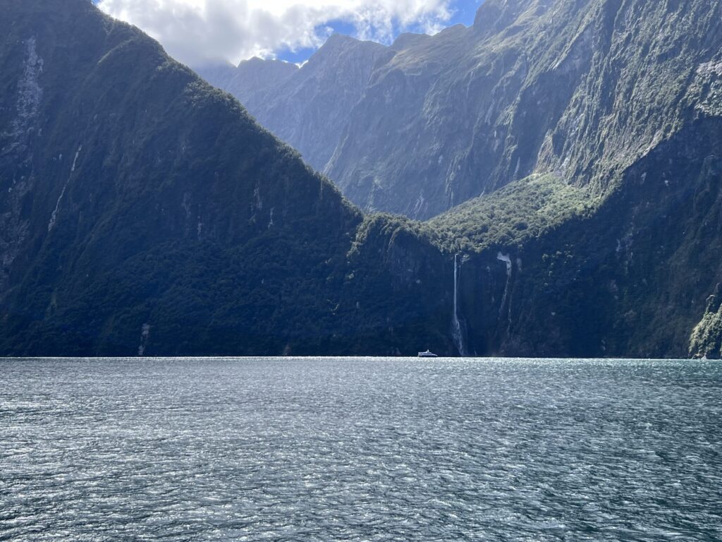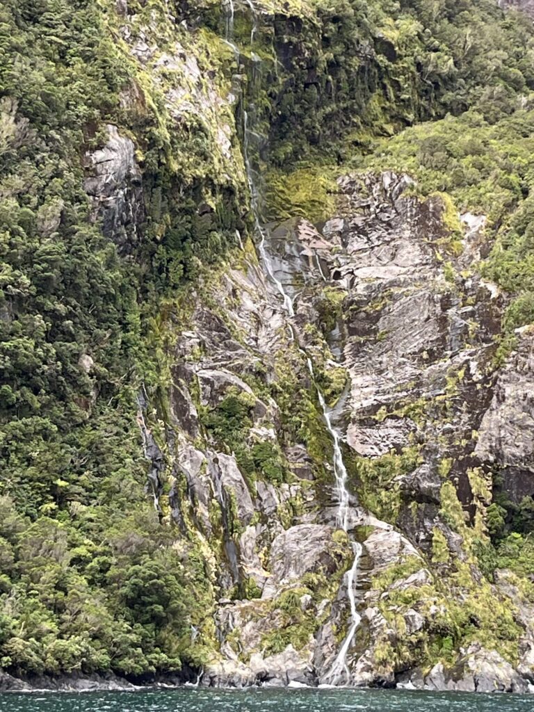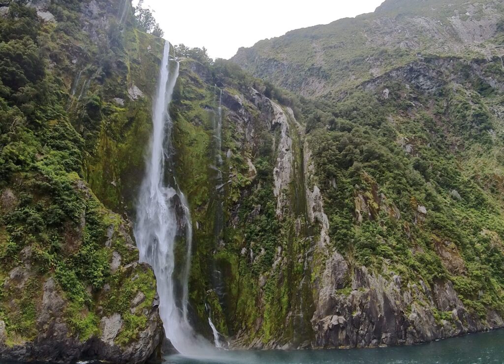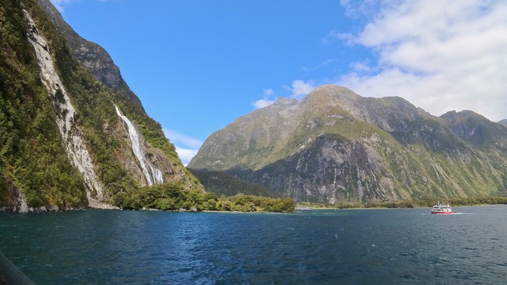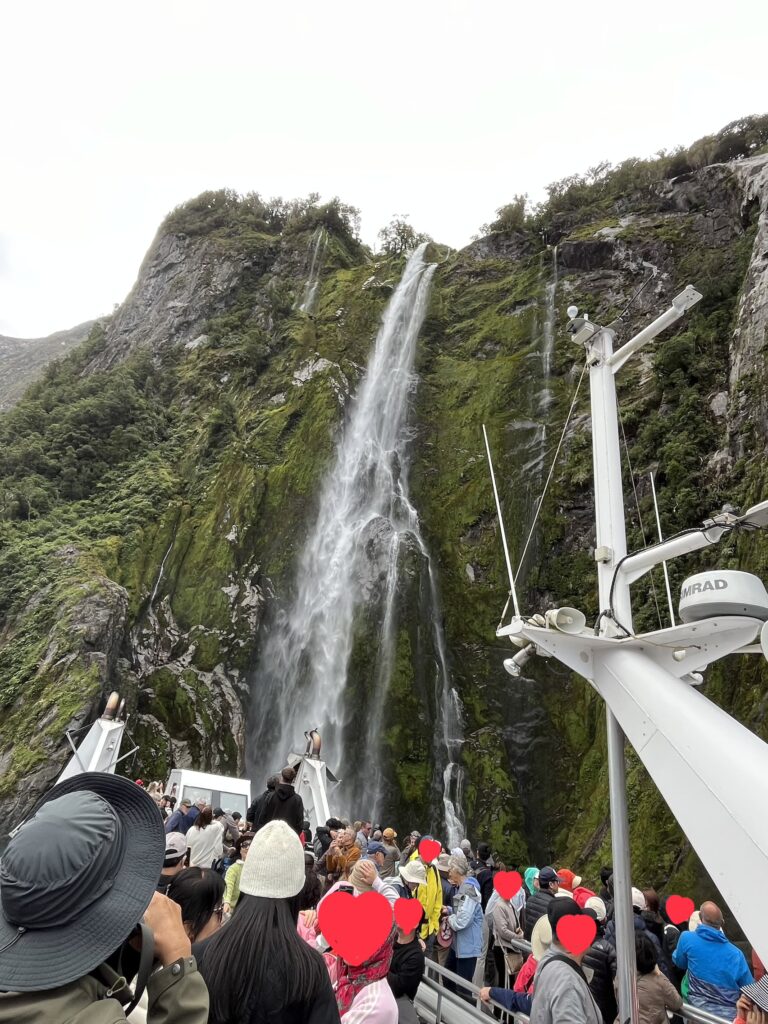 その先に進むと、往路でも見たスターリング滝が現れます。見せ場はこことばかりにクルーズ船が滝の真下にまで寄って行って、デッキにいる我々にマイナスイオンを浴びせようとしてきます。