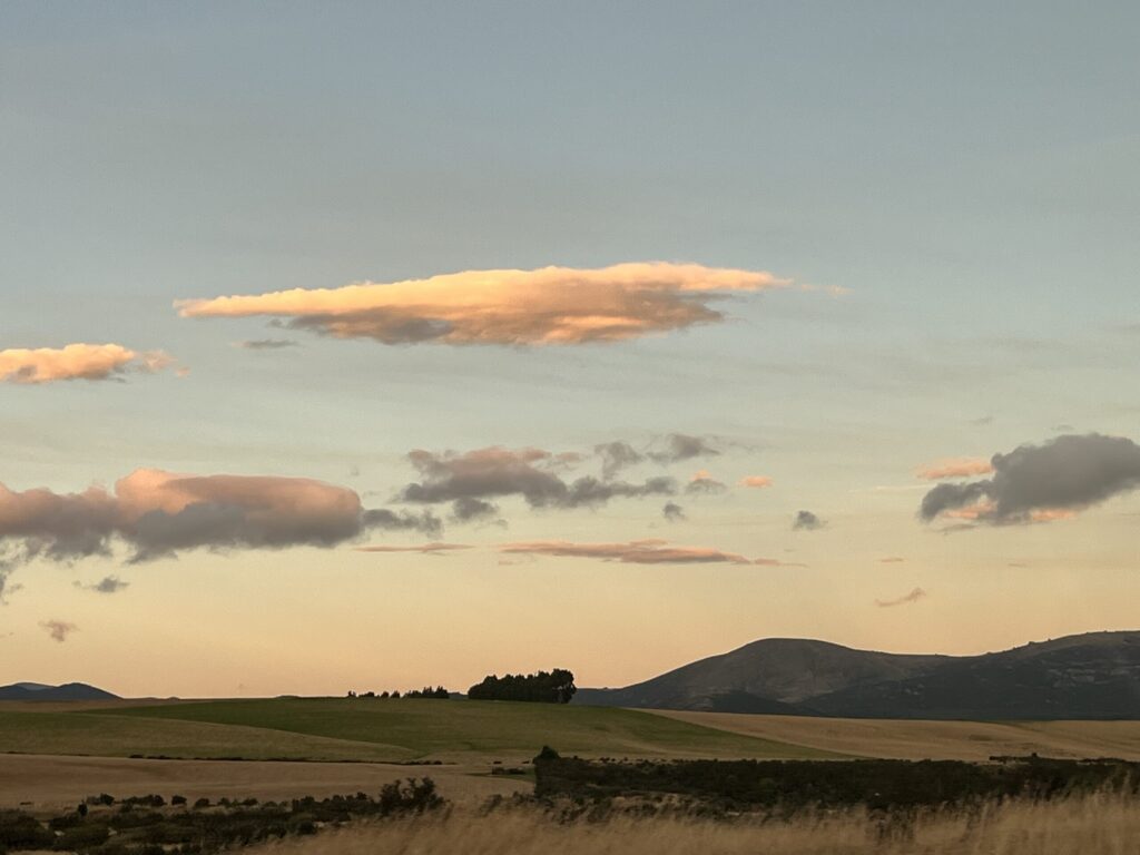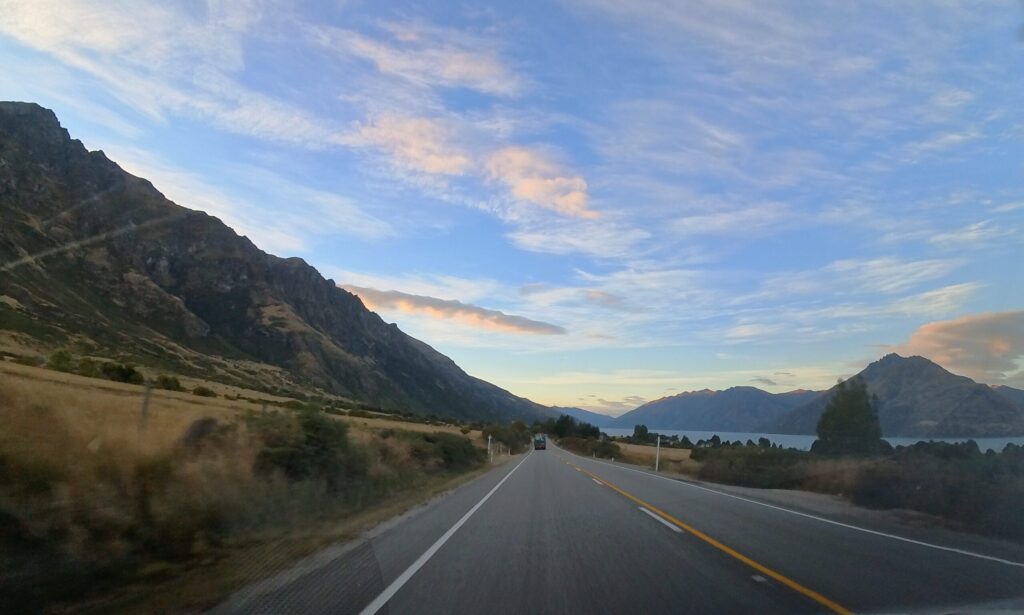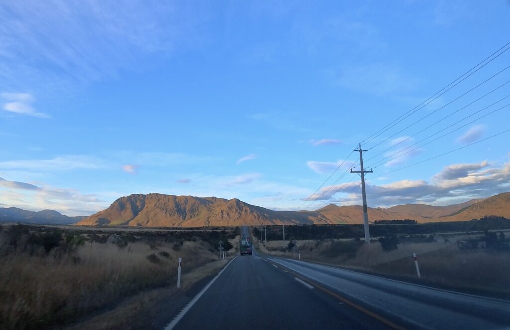 ワカティプ湖沿いのワインディングドライブを楽しんだ後、ワカティプ湖から別れて、大平原を走っていきます。山々が朝日に照らされて神々しかったです。