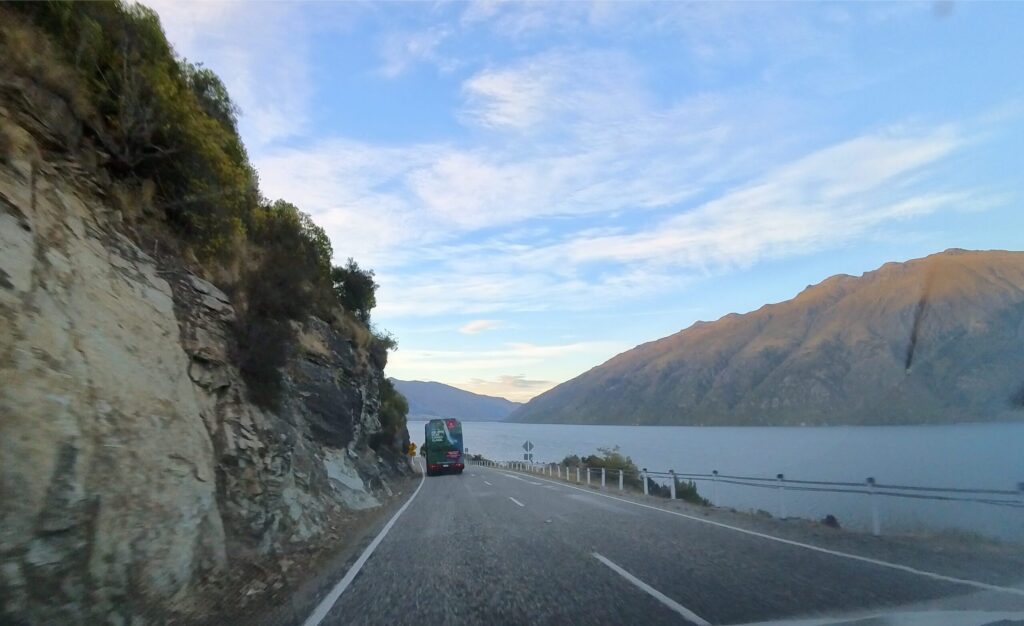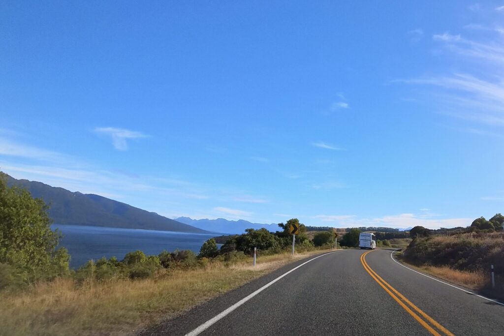 湖畔に沿ってワインディングが続きます。この先が左コーナーで、ワカティプ湖に飛び込んでいくんじゃないか?と錯覚するような道でした。