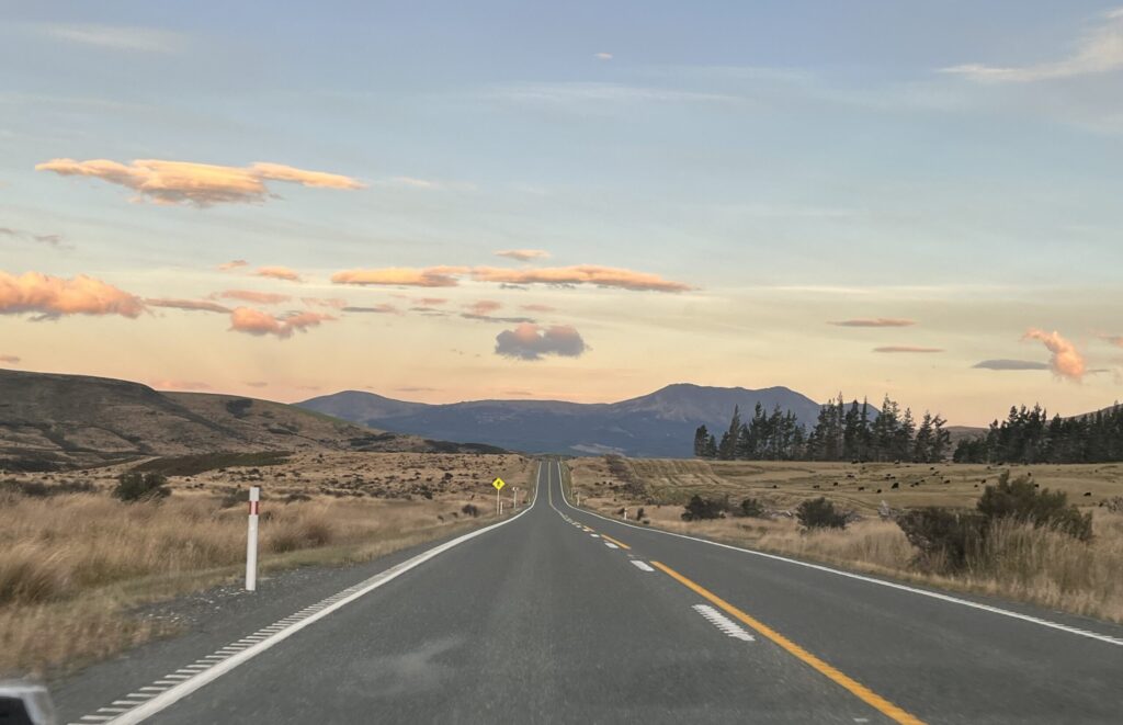 ワカティプ湖沿いのワインディングドライブを楽しんだ後、ワカティプ湖から別れて、大平原を走っていきます。山々が朝日に照らされて神々しかったです。