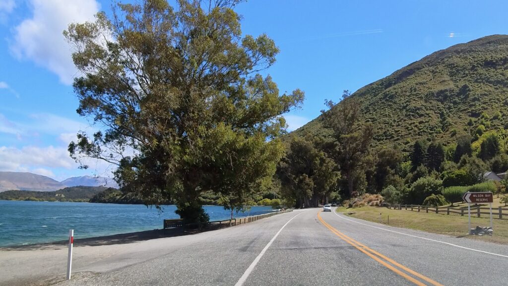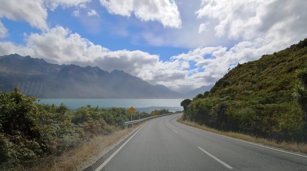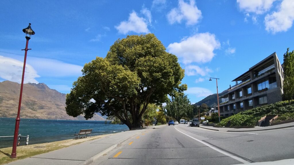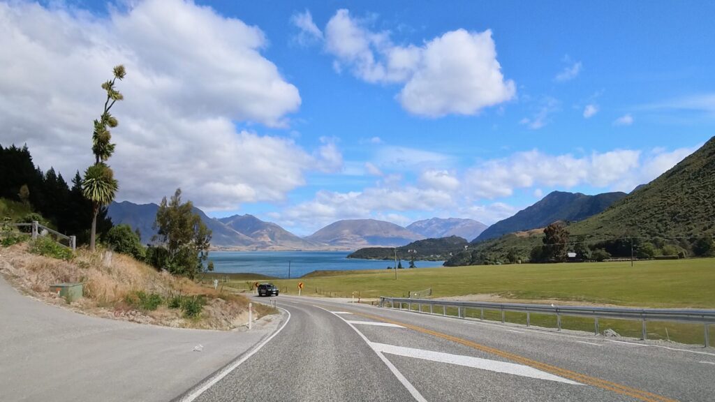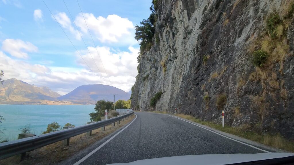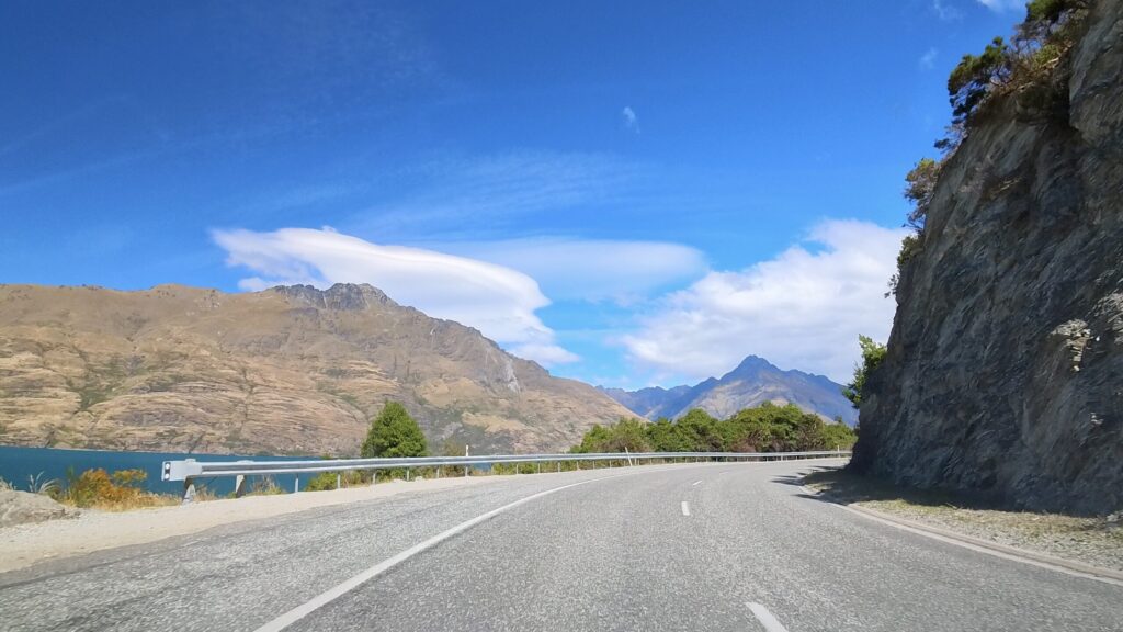 ワカティプ湖に沿ってドライブ開始。青い湖が視界に入り、すごく気持ち良い道です。