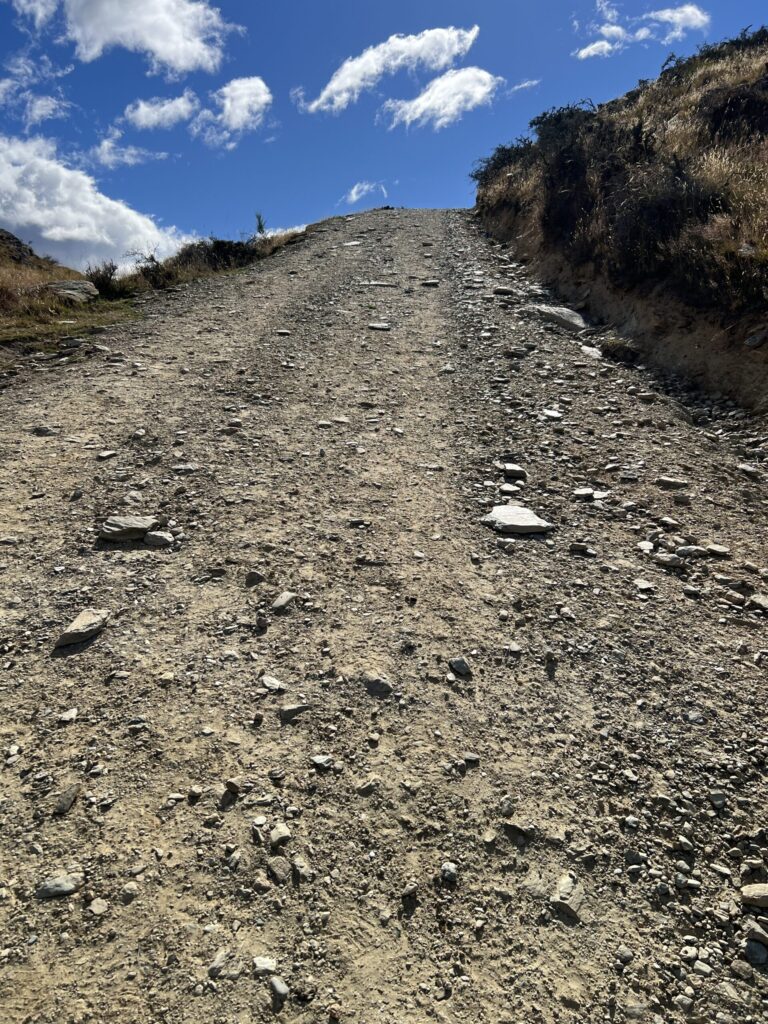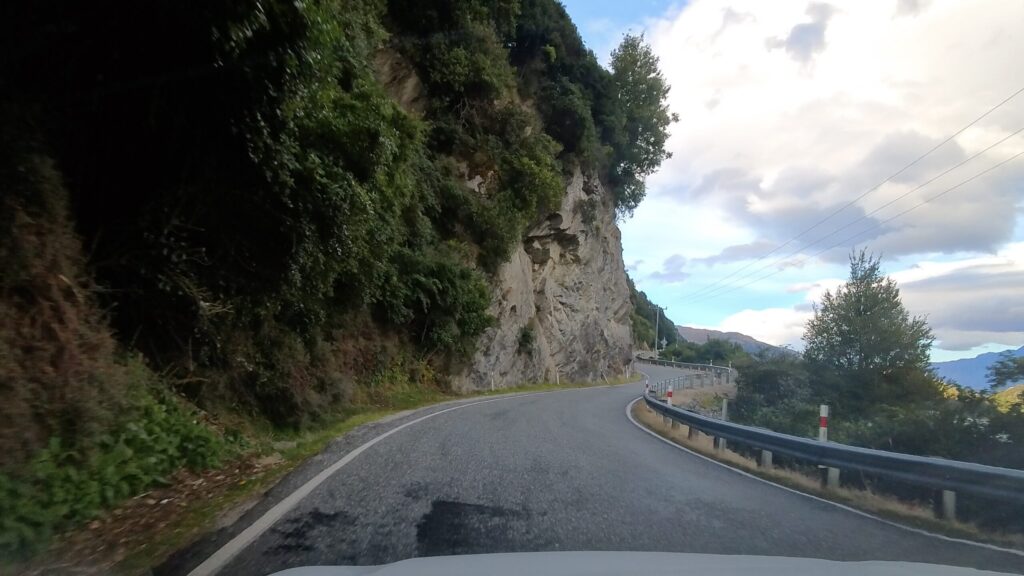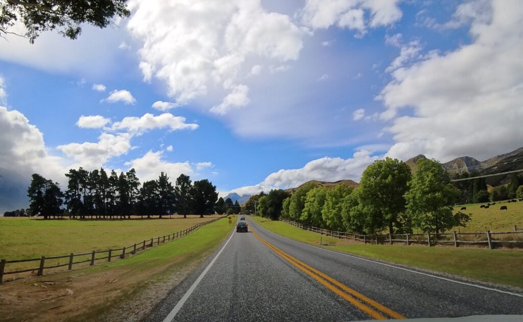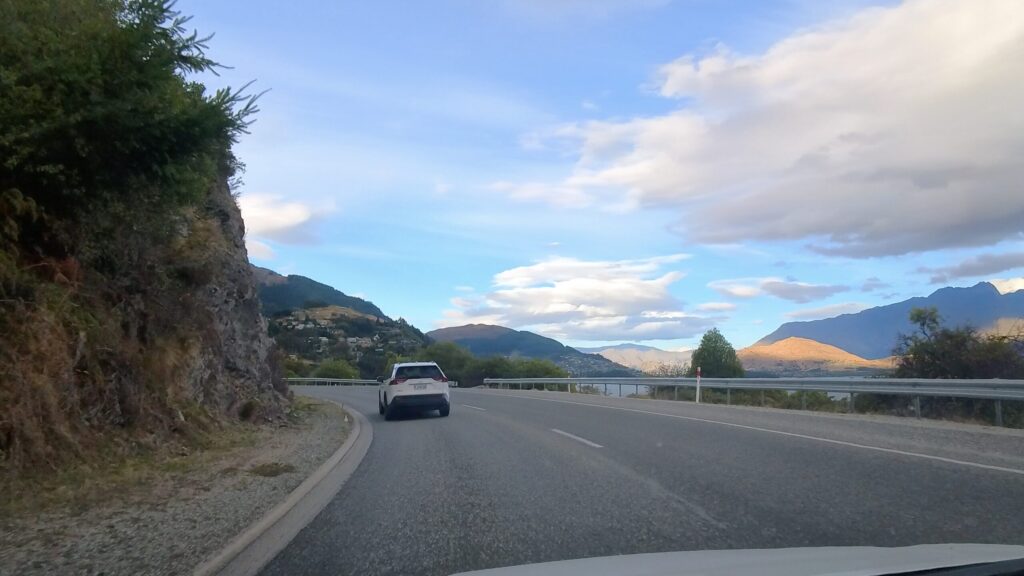 センターラインのない道に差し掛かりました。クイーンズタウンの山々が見えてきました。