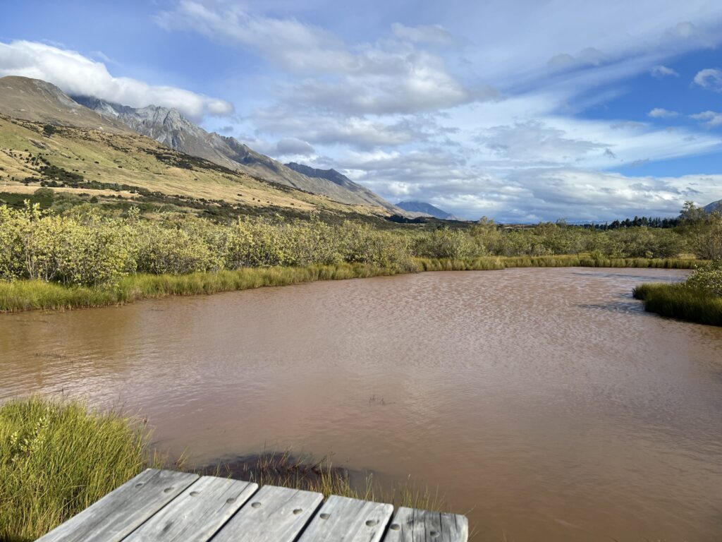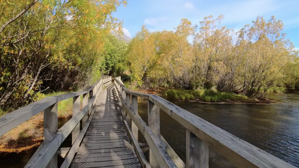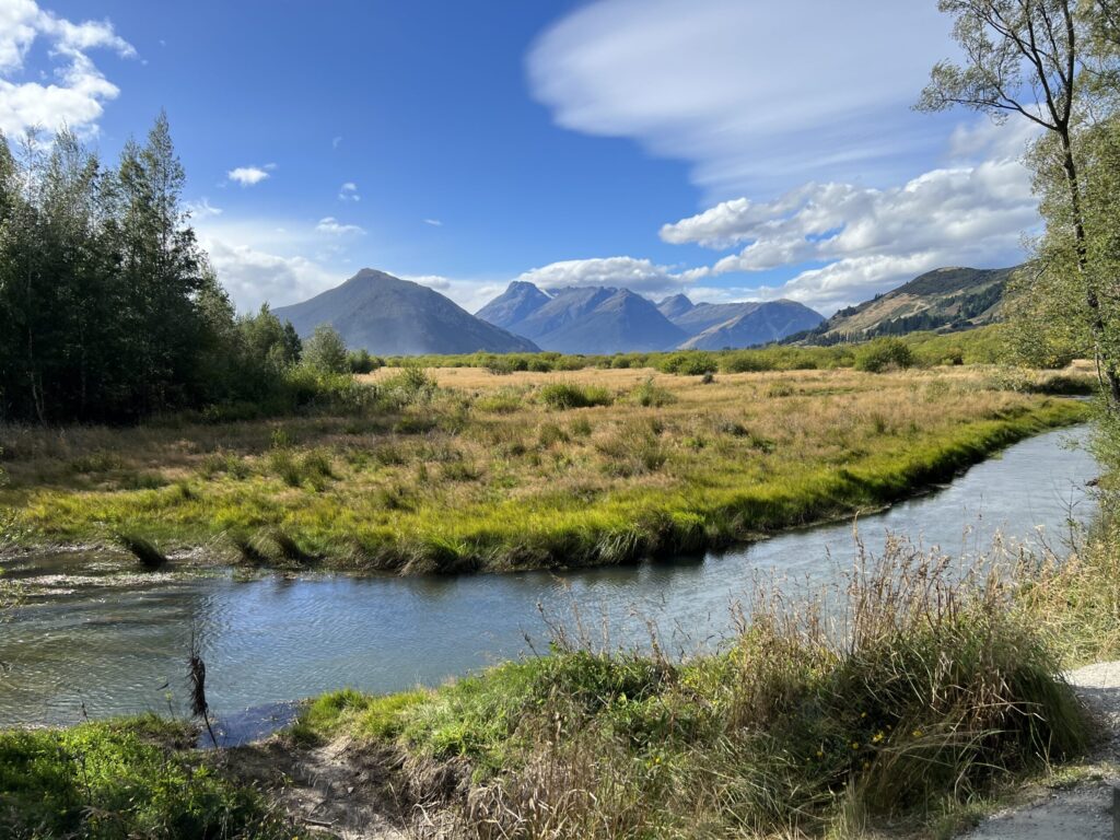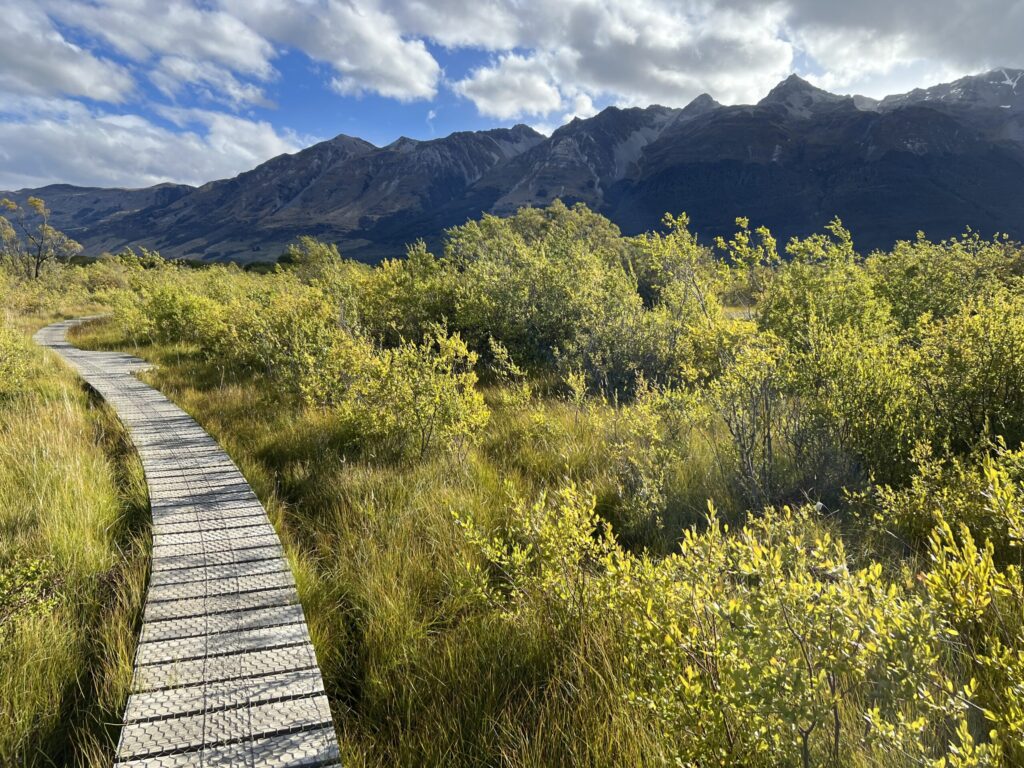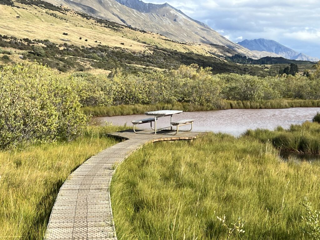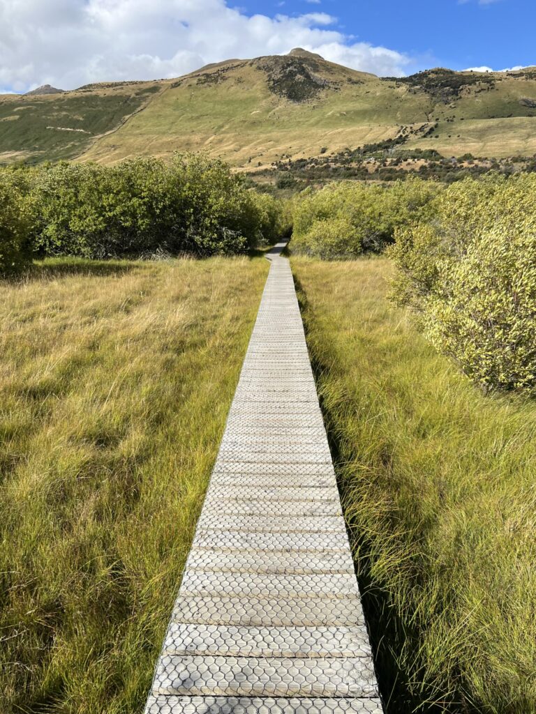 このハイキングコースは約3.2kmの平坦で家族連れにも最適な散策コースです。ワカティプ湖に流れ込む清流を見ながら歩いたあと、ラグーントラックに入って湿地帯を渡る木道からは、湖、ラグーン、周囲の雄大な山々の絶景が楽しめ、特に12月にはルピナスが咲き誇る美しい場所です。