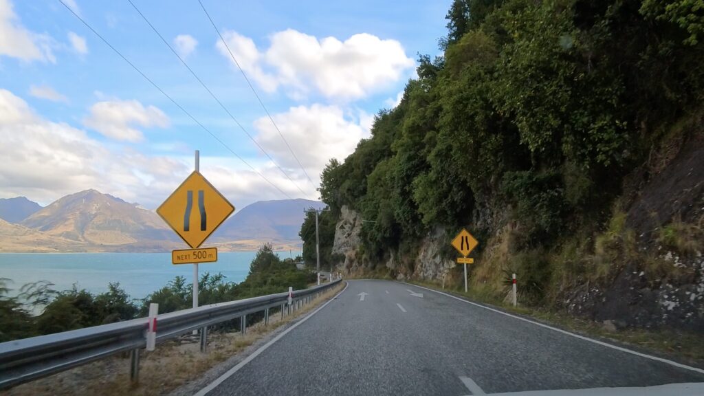 その後も湖沿いのワインディングロードをドライブしていきます。すると幅員減少の看板が見えてきました。