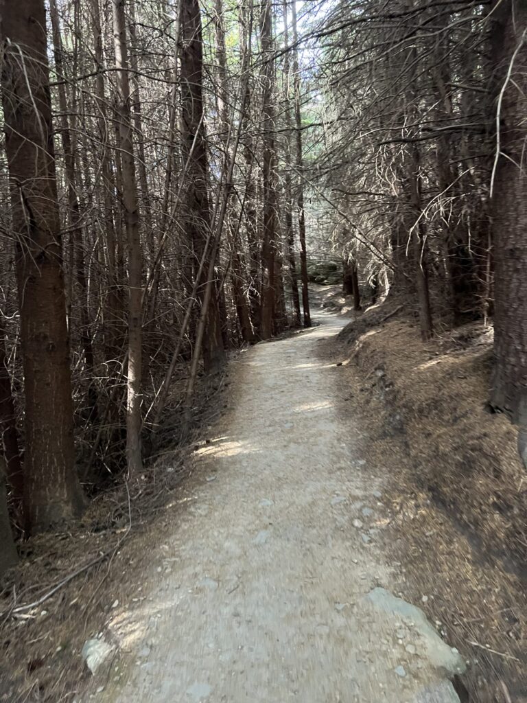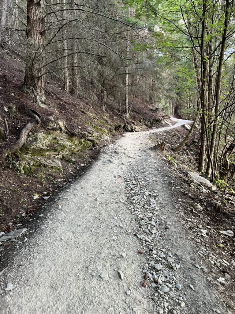 歩いていくとこんな森林の中をずっと歩くルートでした。傾斜は緩く、行きより歩きやすいもののやはり距離がありました。