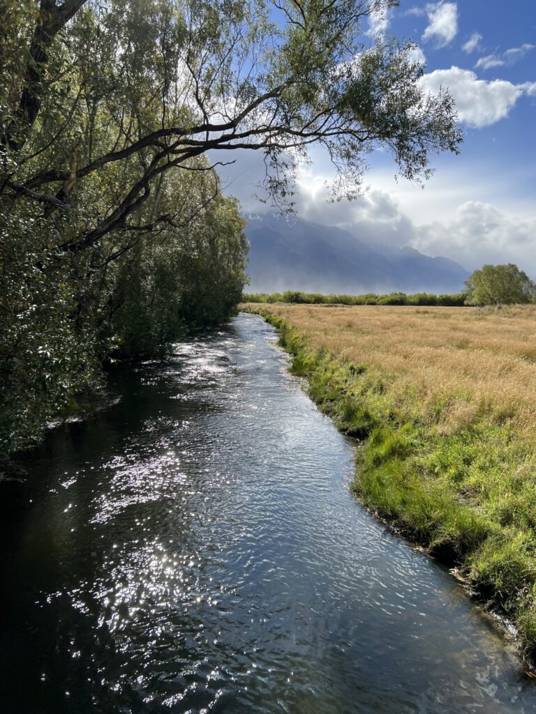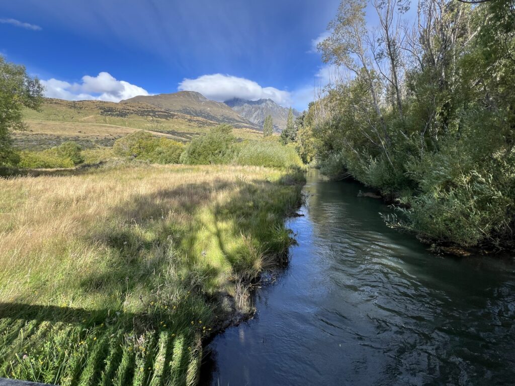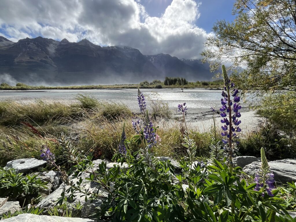 左側にはワカティプ湖に流れ込む清流が見えています。そして、この時期はあまりみることができなかったルピナスを見ることができました。