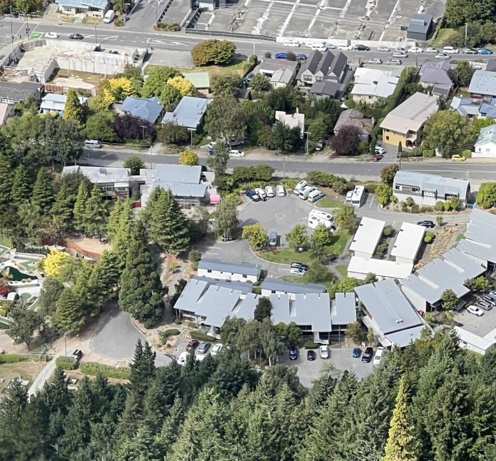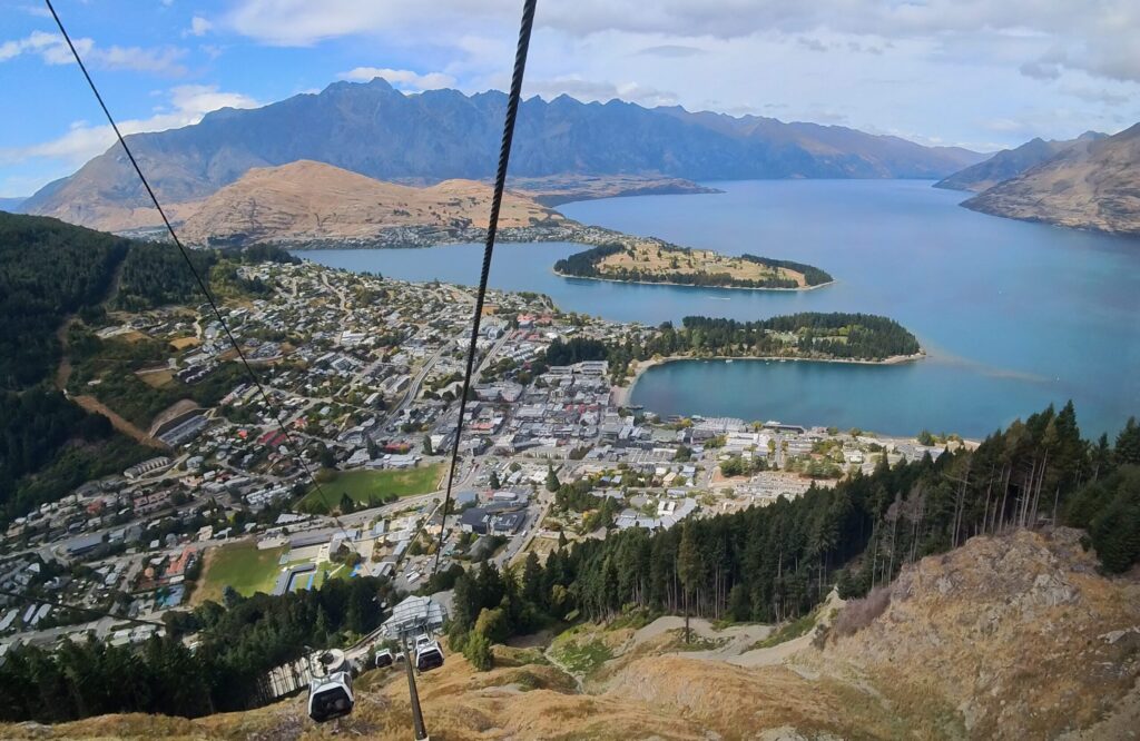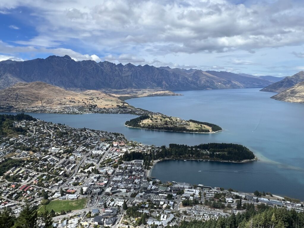 ザリマカーブルズとクイーンズタウンガーデンとゴルフ場のある半島、クイーンズタウンの街並みが見渡せます。