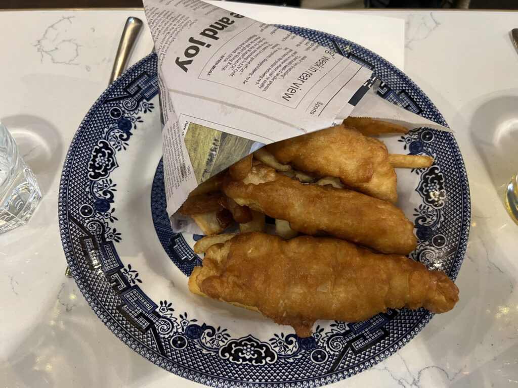 ウエイトレスのお姉さんのおすすめの、フィッシュアンドチップス。サウザンブルーコッズという地元のタラのフライです。肉厚ですごく美味しかった。