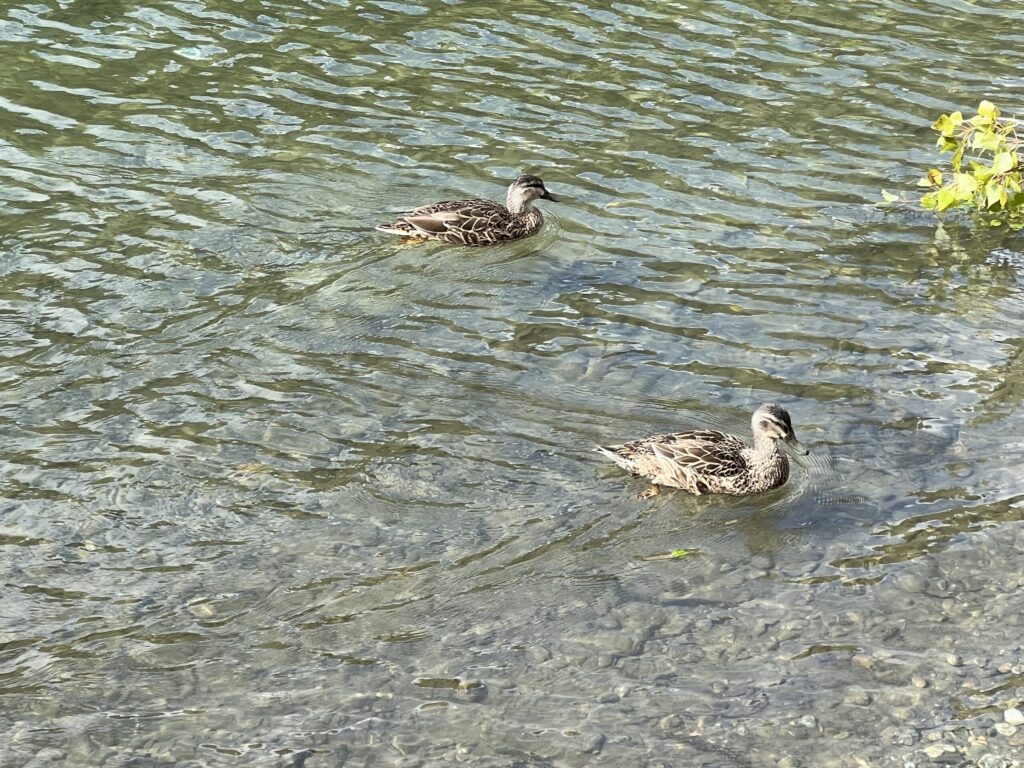 展望スポットということだけあって山と穏やかな清流を見渡せる素晴らしい場所です。カモがこの景色を独り占めしていました。