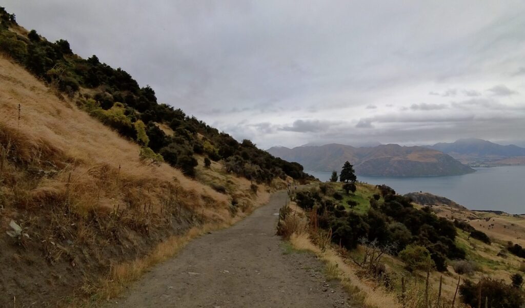 ・頂上付近からワナカ湖と周囲の山々を見下ろす絶景が「天国に続く道」と評される