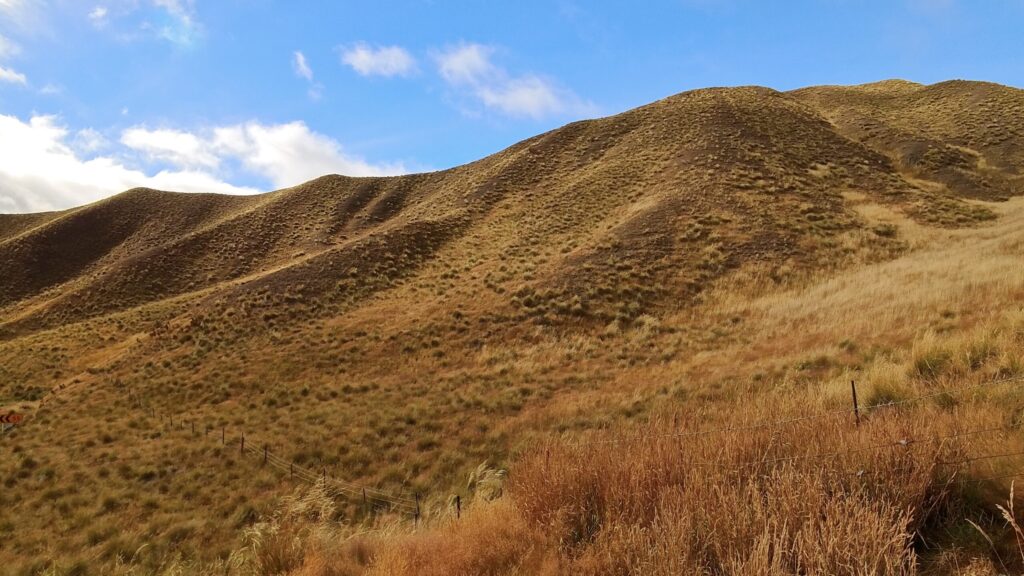 そこの交差点を曲がってしばらく走るとだんだんと、金色に近い茶色の山々を抜けていくようになりました。