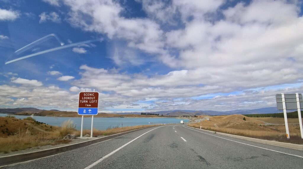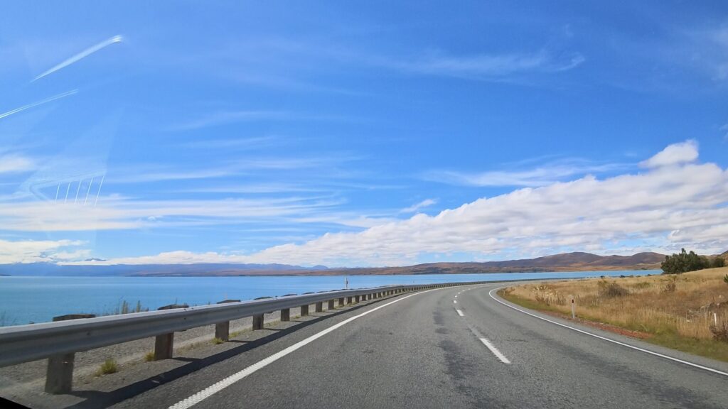すると、青いプカキ湖がずっとついてくる最高なドライブロードになっていきました。いやー絶景の御馳走です!