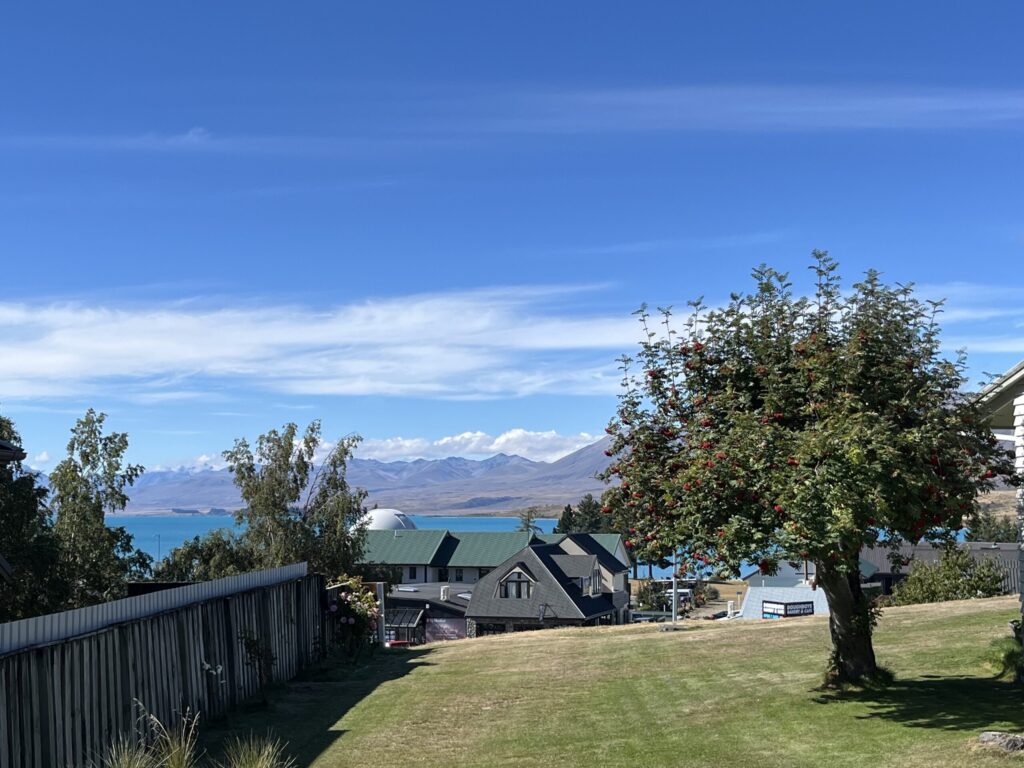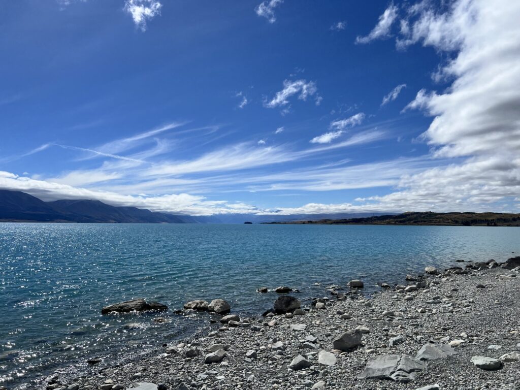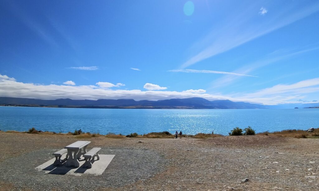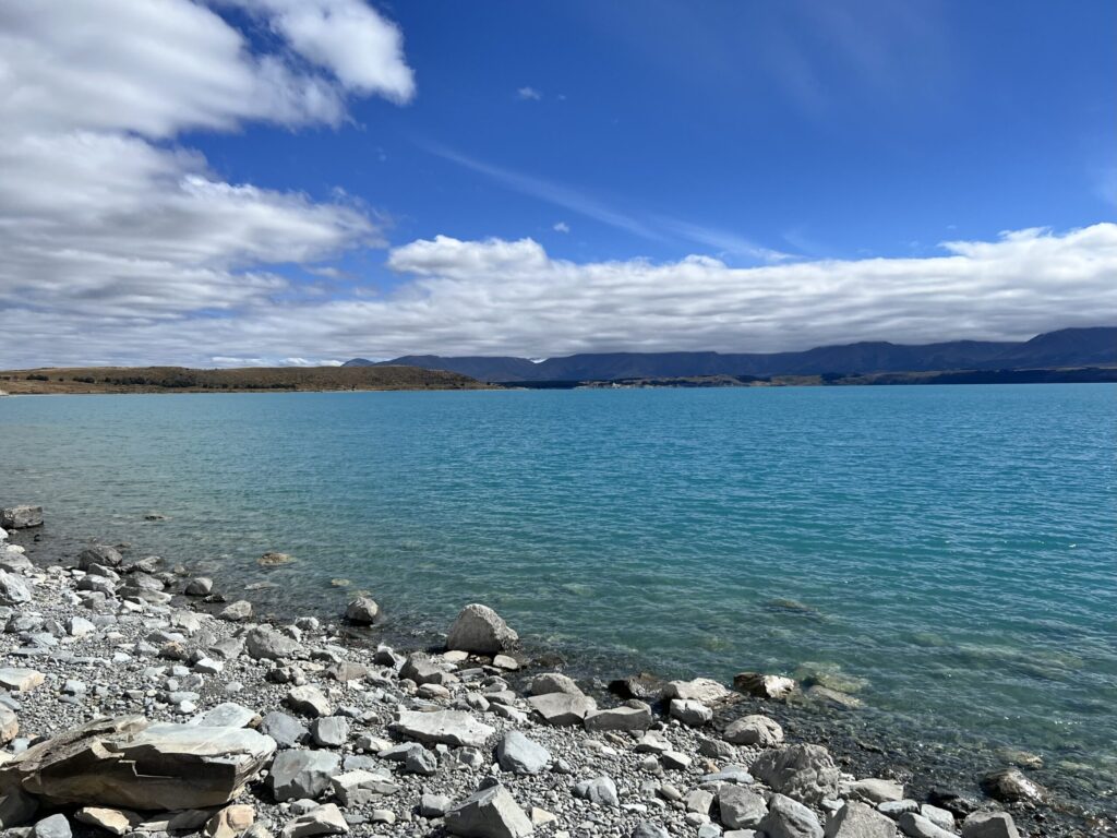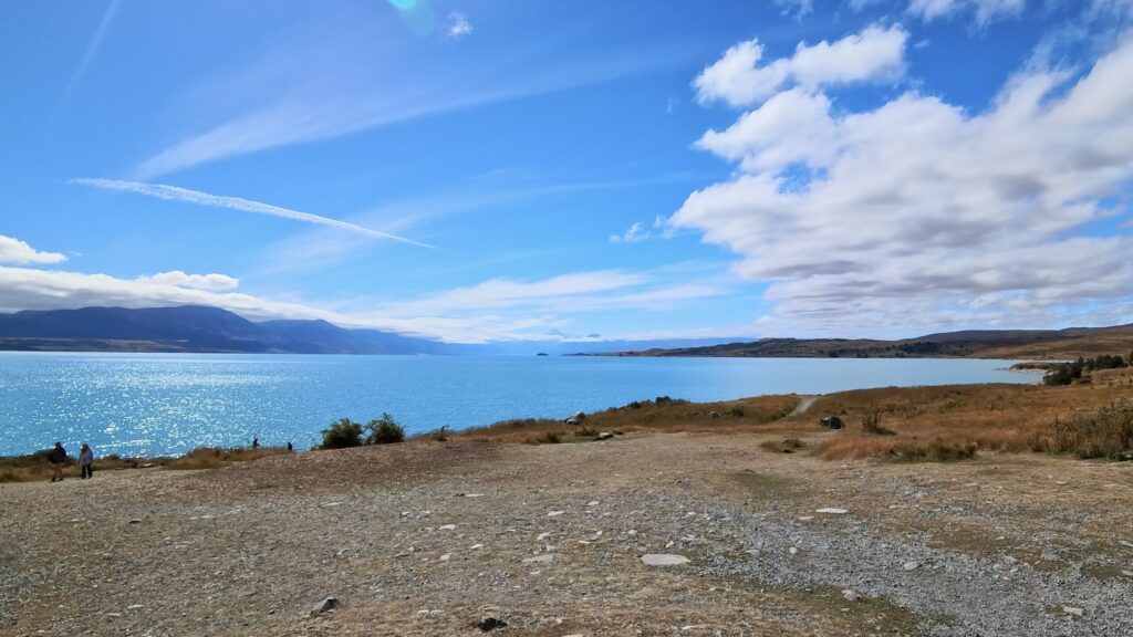 外に出ると、ターコイズブルーのプカキ湖と青空が相まって絶妙な色合いを作り出していました。