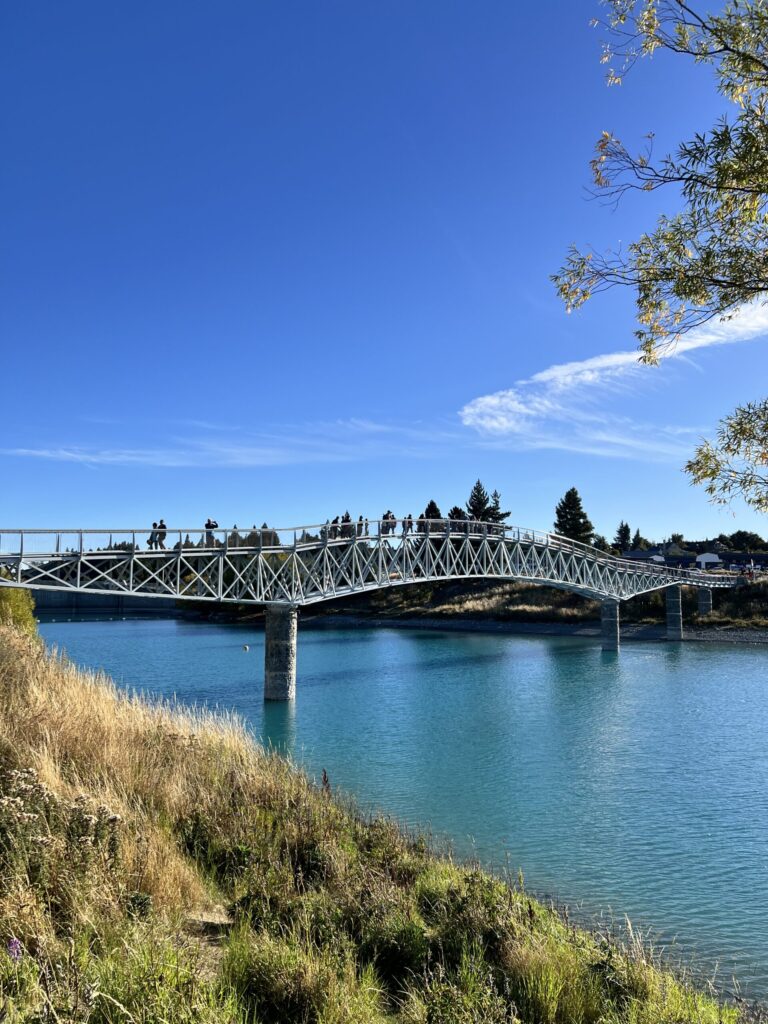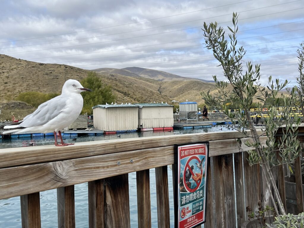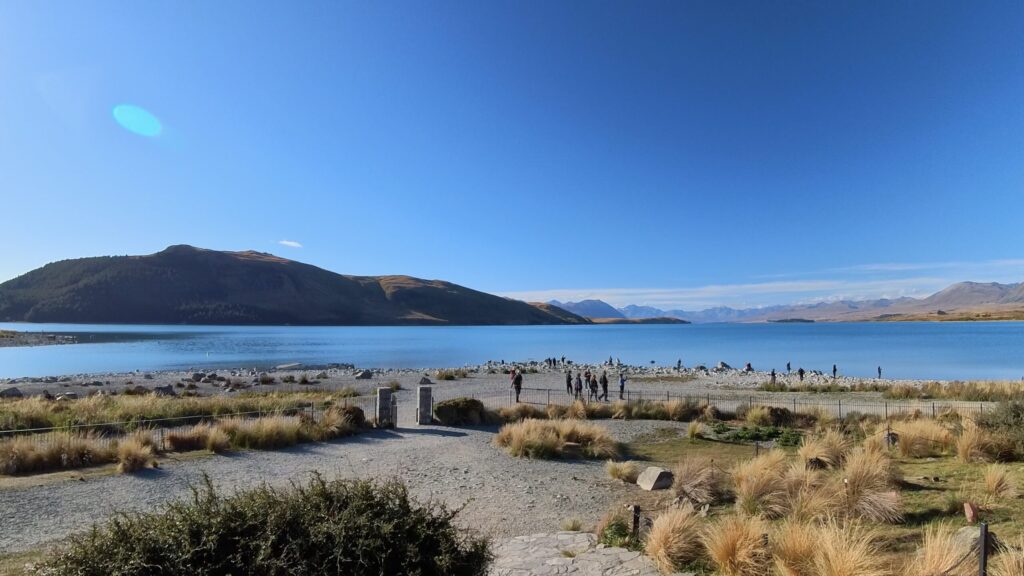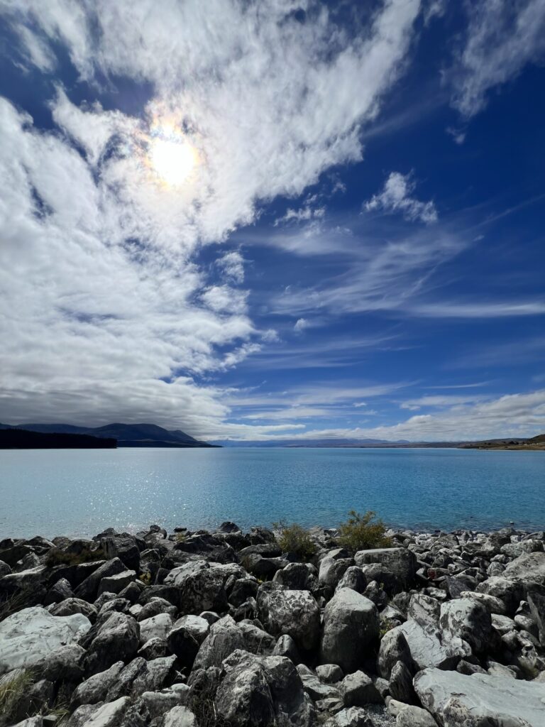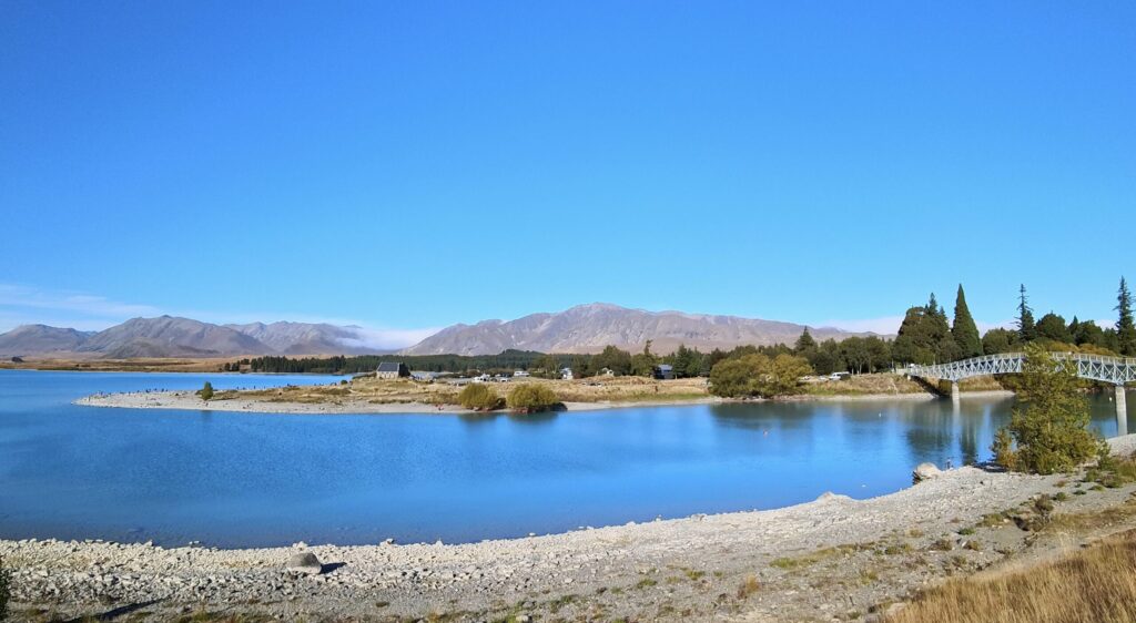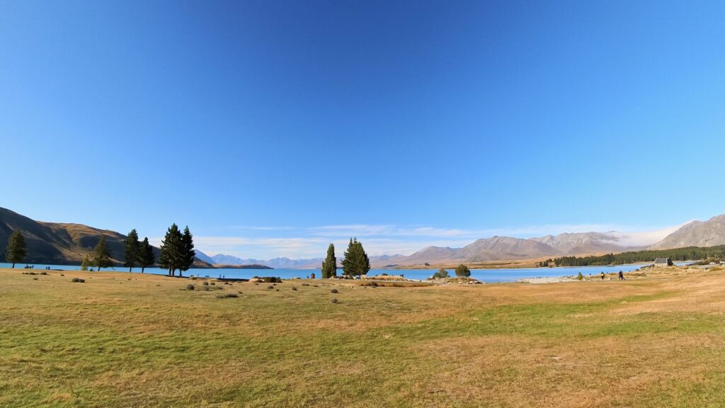 外に出ると、ターコイズブルーのプカキ湖と青空が相まって絶妙な色合いを作り出していました。