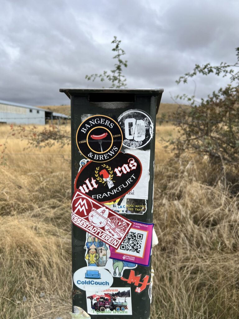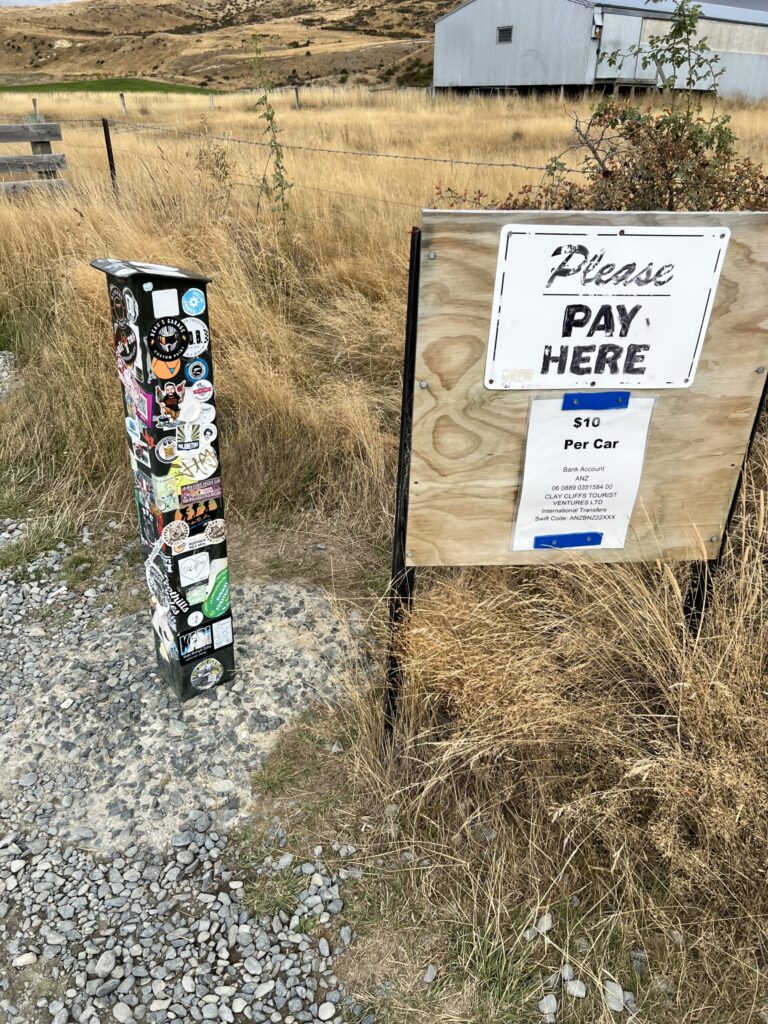 ゲートが見えてきて、その手前で停車。入場料を10USD支払います。この写真の左のシールがベタベタ貼ってる物体に投函口があるのでそこに投入です。