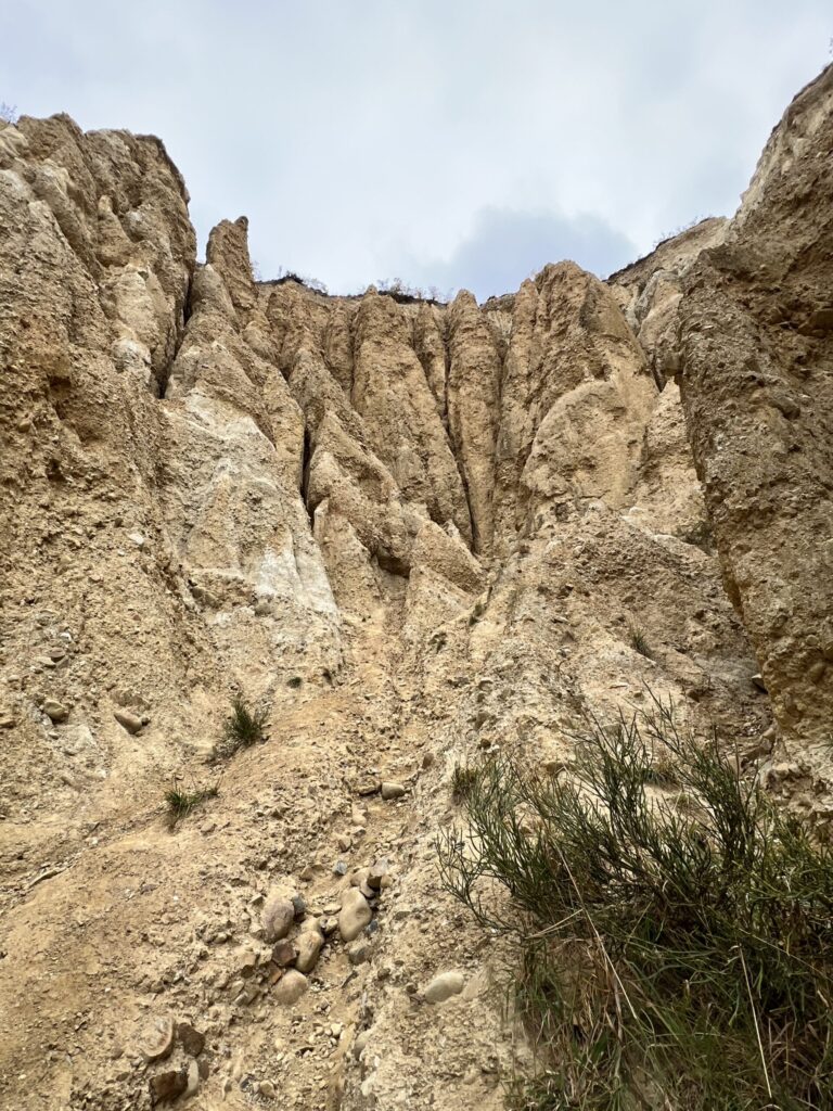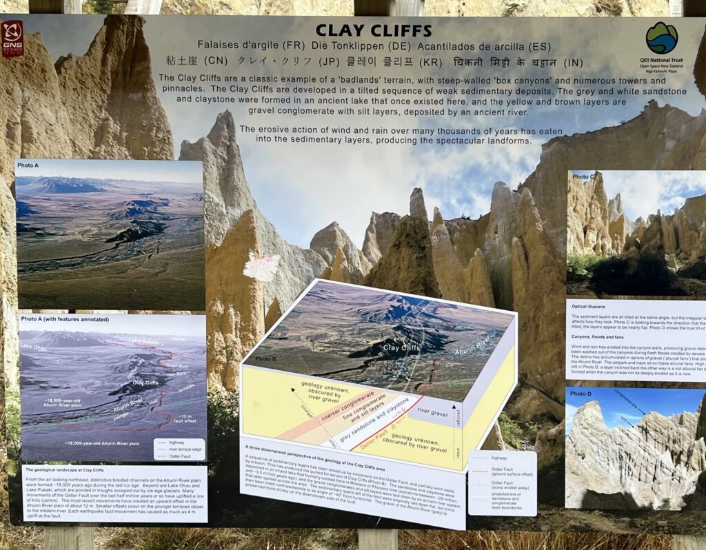 クレイ・クリフスは、急峻な壁の『ボックスキャニオン』と多数の塔や尖塔を備えた、’バッドランズ’という典型的な地形の例です。粘土の崖は、弱い堆積物の傾斜した連続体で形成されています。灰色と白色の砂岩と粘土岩は、かつてここに存在した古代の湖で形成され、黄色と茶色の層は古代の河川によって堆積したシルト層を含む砂利の凝集体です。何千年にもわたる風と雨の侵食作用は、堆積層を蝕き、壮観な地形を生み出しました。