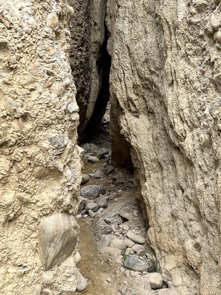 少し登ると岩の壁が現れ、人ひとりがギリギリ通れる岩の隙間が見えて来ました。奥様はもうこの時点で嫌気がさしてリタイア。自分はせっかく来たのだから行くしかないと意を決して隙間に入りました。隙間は本当に狭く、頭一個やっと通る感じでからだを横にしないと通り抜けできないくらい。来ていたライトダウンを壁に擦り破れそうになりながらやっと通り抜けました。