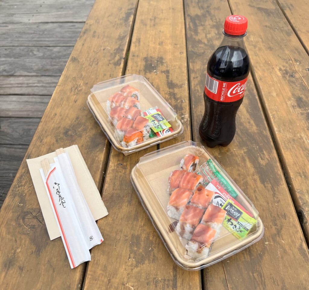 ベーシックにサーモンのお寿司を買って外のベンチで昼食です。