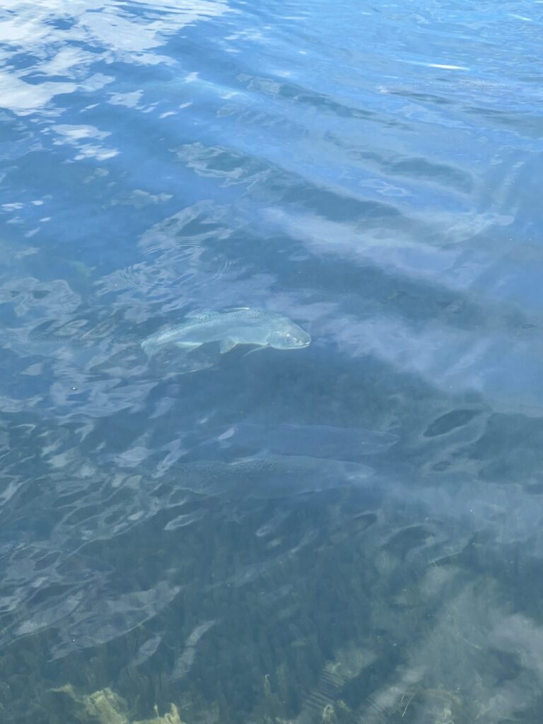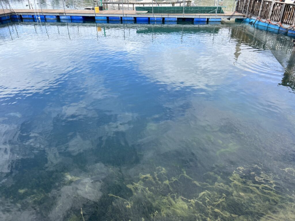 食事後、養殖場の水槽を覗いてみると、鮭が元気に泳いでいました。