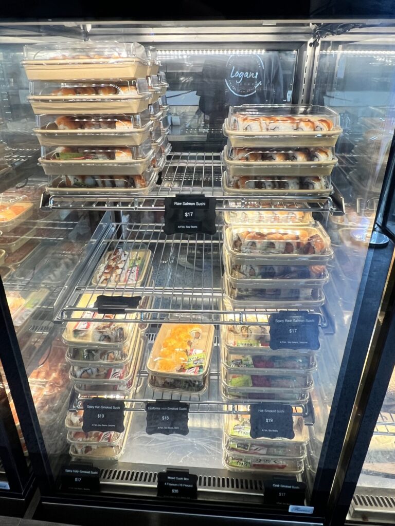 ずらりと並ぶ、刺身、寿司などのサーモン商品の数々。軽食類もありました。