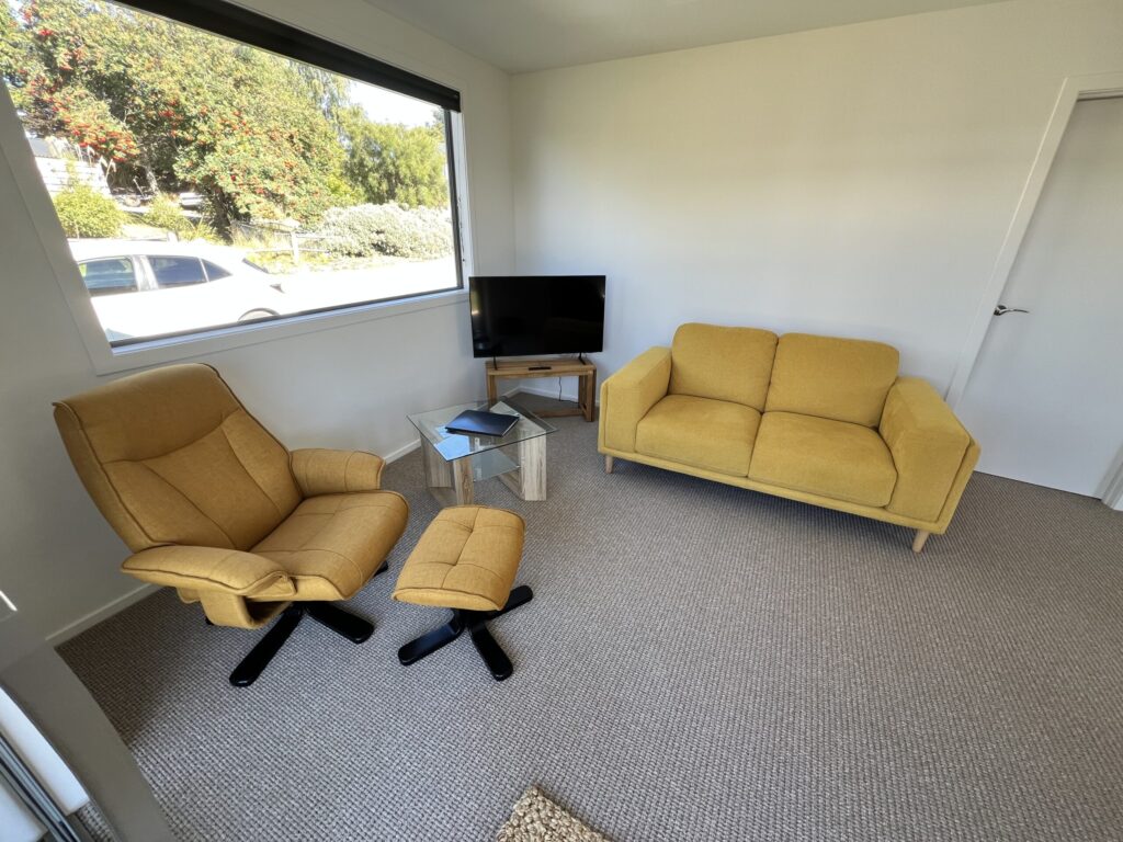振り返るとソファとテレビ。左に写っている一人がけのソファーは天にも登るような座り心地でした。(Googleレンズで調べるとニュージーランド製で日本では売っていないとのこと。残念!!)