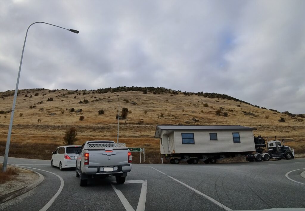 トレーラーが家を運んでいるではないですか!!びっくりです。しかも道幅以上の幅がある家です。